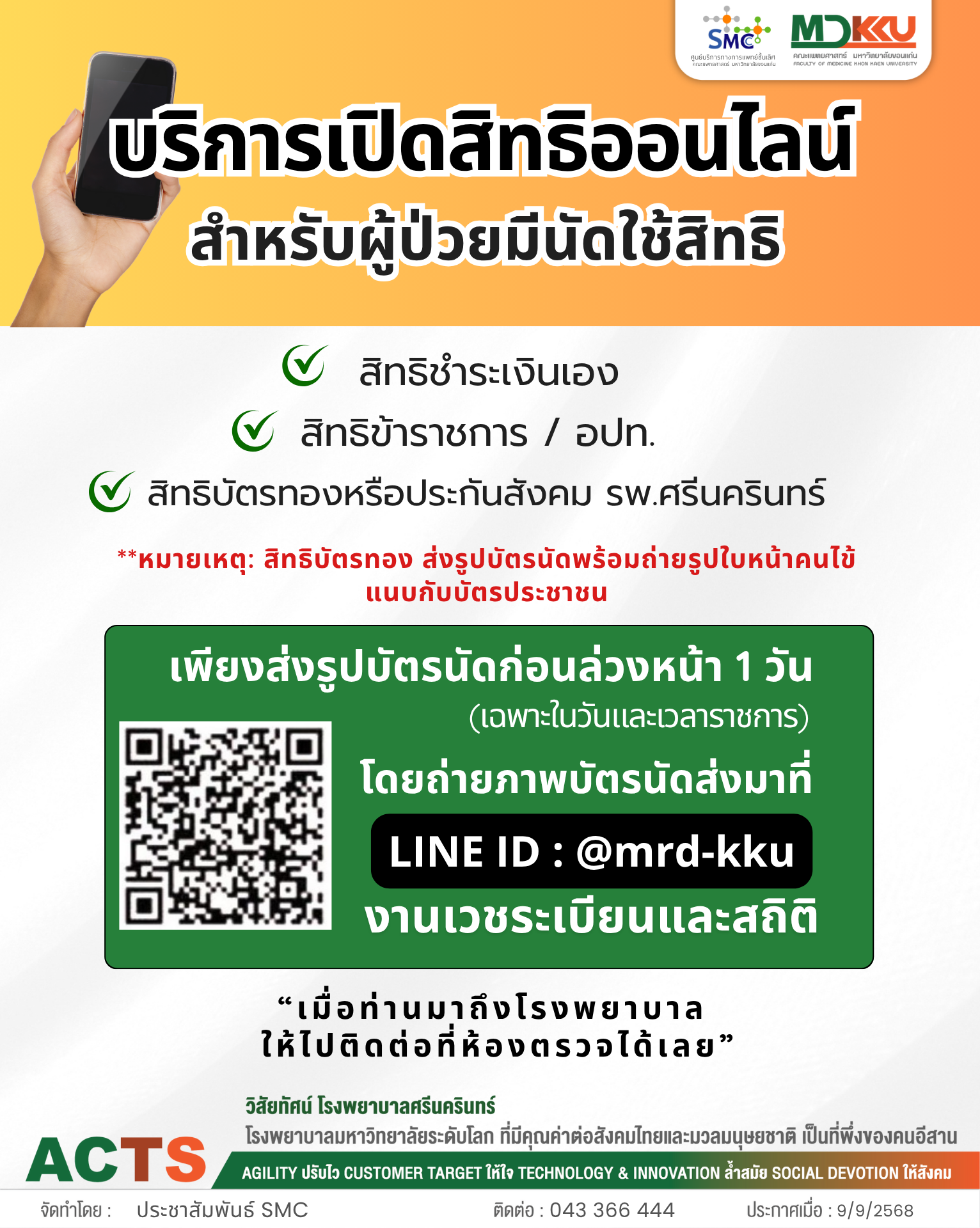 **หมายเหตุ** : สำหรับผู้รับบริการ SMC และโรงพยาบาลศรีนครินทร์ที่มาตรงนัดหมายในวันและเวลาราชการเท่านั้น